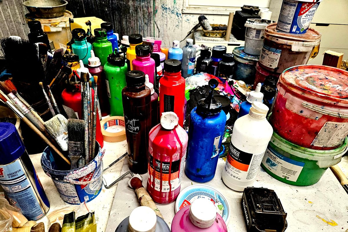 The following images offer an intimate glimpse into his studio — a place filled with texture, color, and the quiet energy of creation.
